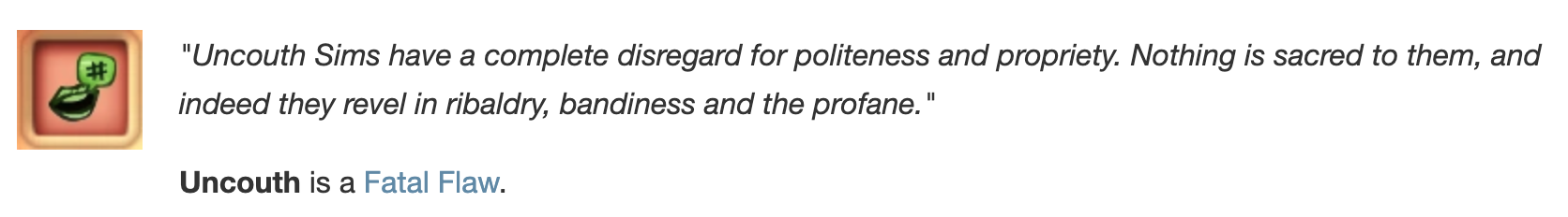 심즈 미디벌(The Sims Medieval)에 보면 심의 특성 중 'uncouth'라는 게 있다. 특성 설명을 보면, 'uncouth'한 심은 예의나 예절을 완전히 무시합니다. 그들에게는 아무것도 신성하지 않고, 그들은 음담패설, bandiness(???), 신성모독을 즐깁니다."라고 되어 있다.