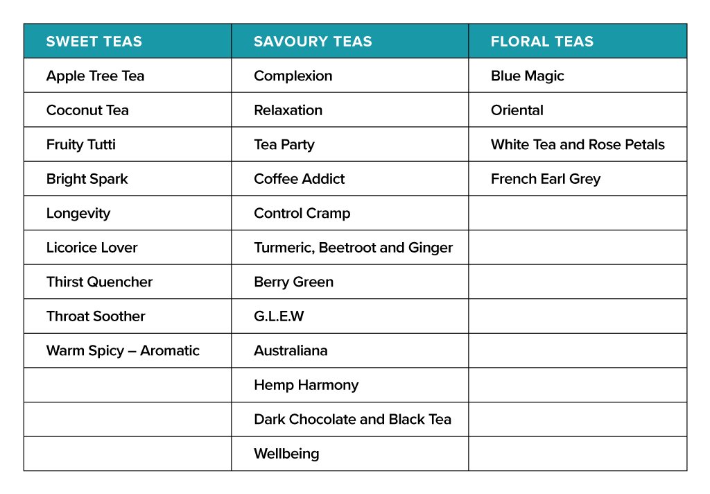 이 외에도 나는 코코넛 티(Coconut Tea), 브라이트 스파크 티(Bright Spark Tea), 롱저비티 티(Longevity Tea), 헴프 하모니 티(Hemp Harmony Tea), 웰빙 티(Well Being Tea)를 좋아했다.