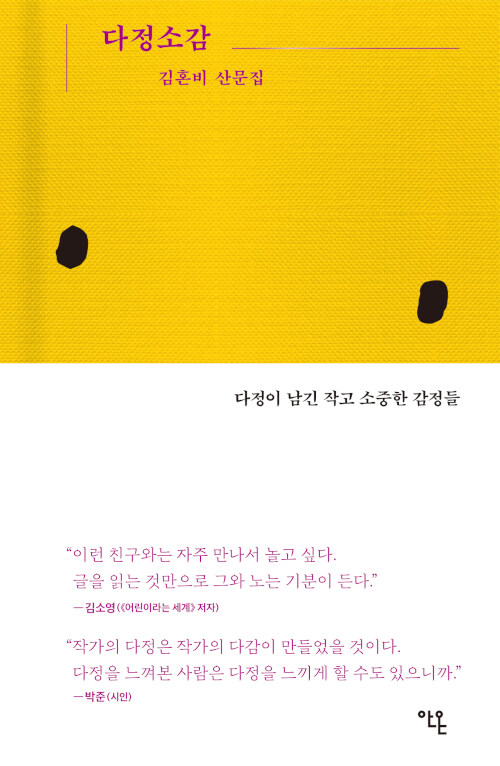 병아리처럼 샛노란 책 표지처럼 귀엽고 사랑스러운 책이다. 책 제목인 '다정소감'은 '다정다감'이라는 표현을 살짝 비튼 것이다. 저자가 살면서 만난 수많은 '다정(함)'의 패턴에 대한 소감을 엮은 책이라는 뜻이다.