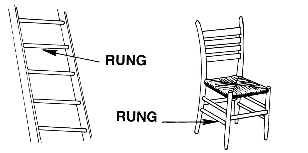 케임브릿지 사전은 'rung'을 "any of the short bars that form the steps of a ladder (= a device used for climbing), or fig. a level or stage of progress((어느 것이든) 사다리의 계단을 구성하는 짧은 막대기, 또는 발전 수준이나 단계를 비유적으로 이르는 말)"라고 정의했다.