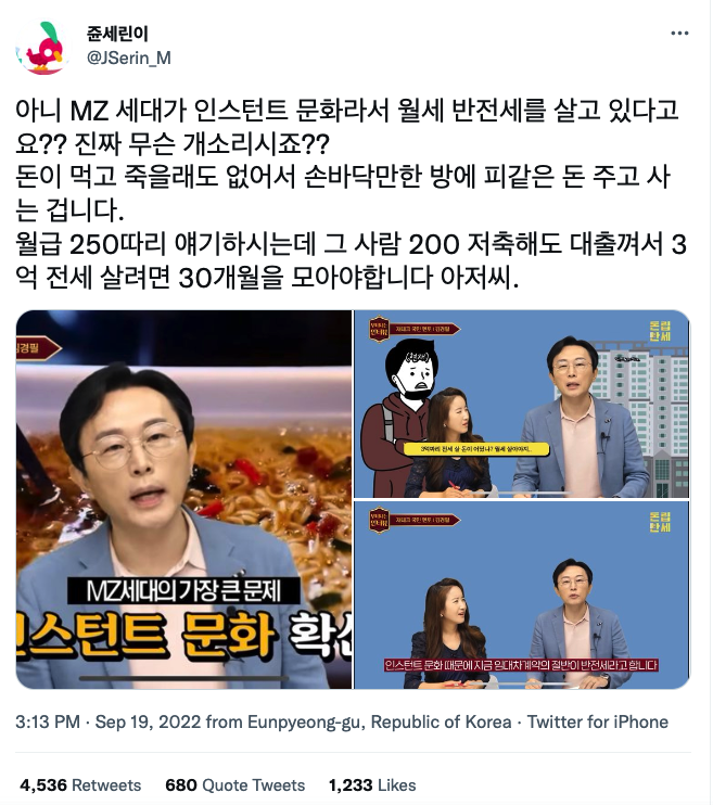 아니 무슨 말이 되는 소리를 해야지. 예쁘장한 카페에서 브런치를 즐기는 문화는 최소한 (밀레니얼인) 내가 대학생 때나 되었어야 한국에서 퍼지기 시작한 건데, 그 전에 무슨 브런치 카페 운운이지? 브런치 문화가 생긴 시기에 대한 내 기억이 틀렸다 치더라도, 묘사하는 바에 따르면 엄마는 아이를 학원에 데려다주는 극성 엄마인 거 같은데 그런 게 정말 대중적으로 공감받을 수 있는, '맞아, 우리 엄마도 그랬어' 하는 반응을 일으킬 수 있는 대중적인 경험인가? 있는 집에서야 그랬을지 모르지만, 이 논문에 따르면 X세대(Y세대의 부모 세대)는 맞벌이 비율이 61.5%로 가장 높았다는데요? 맞벌이하는 부부의 아내/엄마 쪽이 어떻게 애를 학원에 직접 데려다주고 한가하게 브런치를 즐깁니까? 분신술이라도 쓰시나?