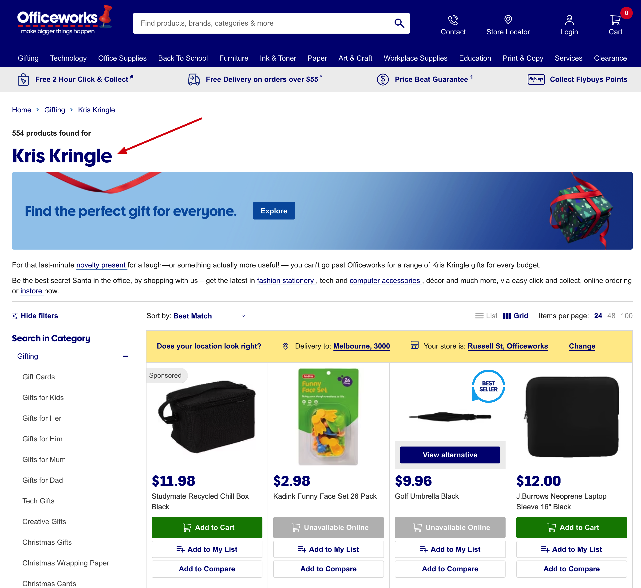 크리스 크링글 선물 아이디어를 몇 가지 꼽자면, 역시 제일 무난한 건 먹는 거다. 페레로 로쉐나 캐드버리 같은 브랜드에서는 잘 포장된 선물용 초콜렛을 이맘때쯤 출시하고, 쿠키나 사탕도 괜찮다. 술을 좋아하는 호주인들답게 칵테일 믹서(mixer)도 자주 선물 목록에 오른다(올해 사내 크리스 크링글에 두 번이나 출현했다). 와인? 이건 호주인들 상대로 언제나 100% 성공하는 선물이다. 또한 여초인 그룹 대상이라면 바디 워시나 핸드 크림 세트도 아주 무난하다. 귀엽거나 웃긴 머그 컵은 스테디 셀러다. 이것저것 생각하기 귀찮다면 콜스(Coles)나 울워스(Woolworths) 같은 마트 기프트 카드도 괜찮다. 여기에서 조금 더 신경 쓴 티를 내고 싶으면 마이어(Myer) 백화점 기프트 카드 정도? 호이츠(Hoyts)나 빌리지 시네마(Village Cinemas) 같은 영화관에서 쓸 수 있는 영화 바우처(voucher)도 좋을 것 같다.