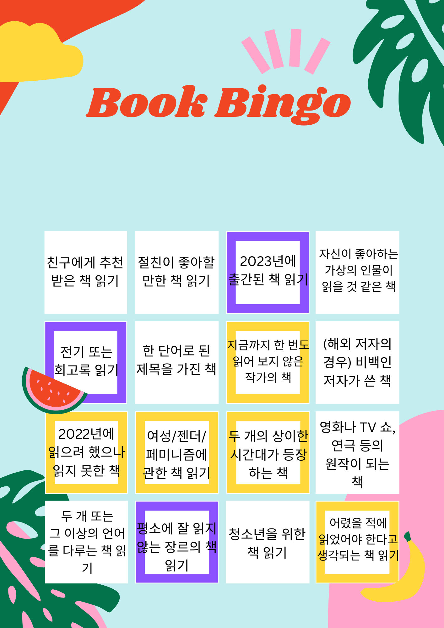 2월에 성공한 챌린지는 아래 빙고판에 보라색 테두리로 표시했다(노란색은 1월).