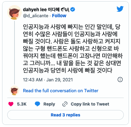 또한 심너울 작가의 <나는 절대 저렇게 추하게 늙지 말아야지>에 수록된 단편 <컴퓨터공학과 교육학의 통섭에 대하여>도 떠올랐다. 내용은 간략하게 소개하자면, 경상도의 어느 작은 분교에 하나뿐인 학생이 ‘친구 봇’과 친구가 되는 이야기이다. 인공지능 로봇이라지만 상대가 하는 말을 적당히 알아들은 척하고 맞장구 쳐 주는 기능밖에 없는 이 친구 봇을, 이 학교의 유일한 학생 유림이는 아끼고 진짜 친구처럼 대한다. 이 단편에 대해 심너울 작가는 이렇게 썼다(출처는 이 단편집 맨 뒤에 있는 ‘작가의 말’인데, 인터넷 서점의 책소개에서도 쉽게 찾아볼 수 있다).