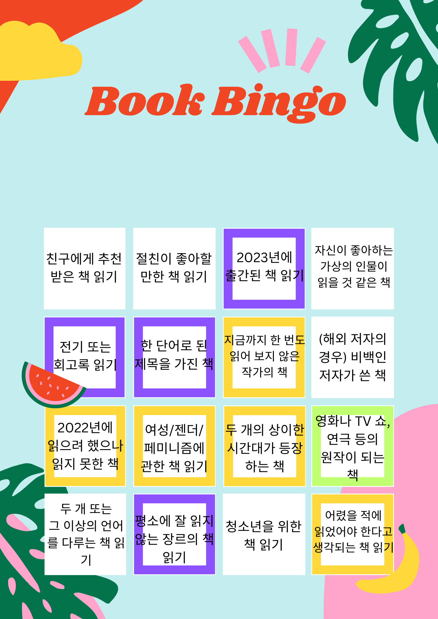 제일 빠르게 빙고 한 줄을 만들려면 ‘(해외 저자의 경우) 비백인 저자가 쓴 책’ 챌린지를 완료하는 것인데, 여기에 딱인 책이 하나 있다. 이북이랑 오디오북이 있는지 찾아봐야겠다. 다음 달엔 이걸 체크할 수 있도록 의식적으로 신경 써서 이 책을 읽어야겠다. 어떤 책인지는 완료 후 공개할 예정.