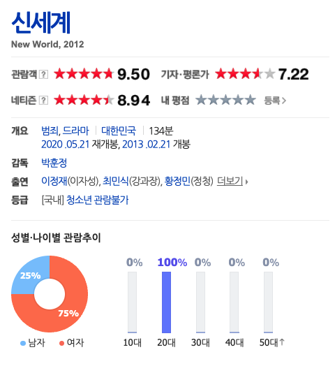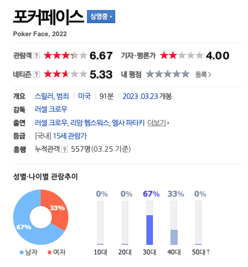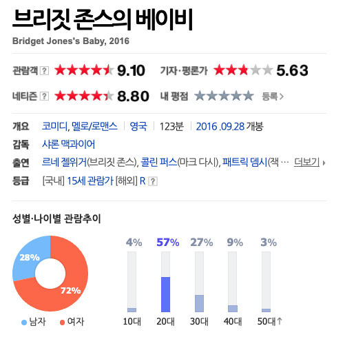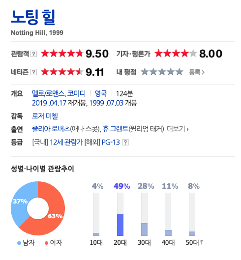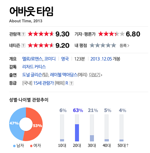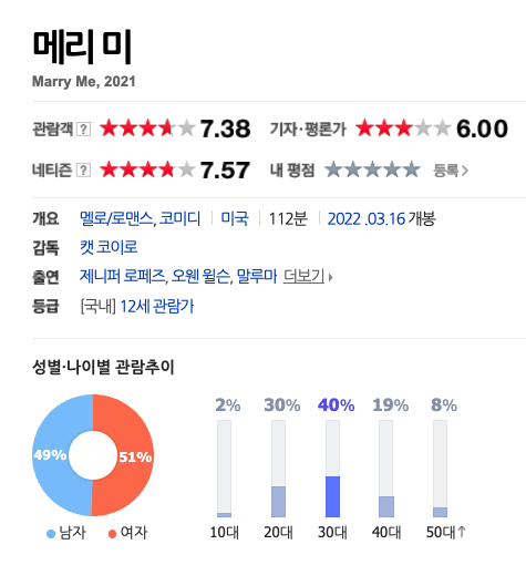 이러한 점들 때문에 나는 이게 ‘남자를 위한’ 로맨스라는 결론을 내린 것이다. 그리고 순전히 호기심 때문에 네이버 영화에서 제공하는 관객 분석(성별 및 나이별)을 찾아봤는데, 정말 놀라울 정도로 성비가 반반이었다(내가 이 글을 쓰는 3월 말 기준). 대조를 위해 몇몇 유명한 로맨스(로맨틱 코미디) 영화를 검색해 보았는데, 이렇게까지 남녀가 비슷한 정도로 본 영화는 없었다(<메리 미>를 제외하고는 <어바웃 타임>이 그나마 남녀 성별이 반반에 가깝다). 참고용으로 소위 ‘남자’ 영화도 두 편 골라 캡처했다.