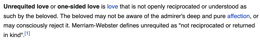 ‘unrequited love’ 또는 ‘one-sided love’라고 한다. 위키페디아는 이를 “사랑하는 상대에게 공개적으로 화답받지 못하거나 이해받지 못하는 사랑”이라고 설명했다.