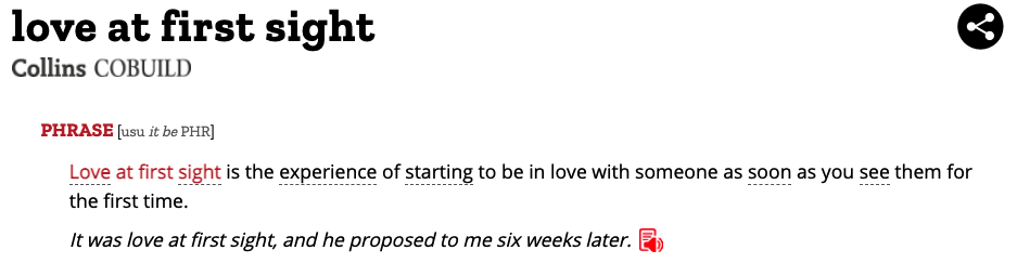 이건 너무 쉽다. ‘love at first sight’라고 한다. 아래에서 볼 수 있듯이 콜린스 사전은 ‘love at first sight’를 “누군가를 처음으로 보자마자 사랑에 빠지기 시작하는 경험”이라고 정의했다.