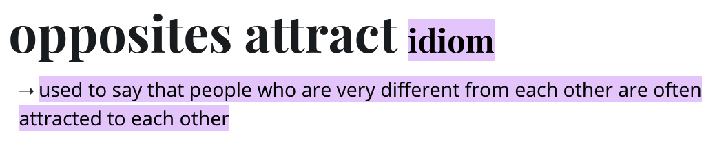나와 다른 사람이 끌리는 것은 동서고금을 막론하고 전 세계적으로 흔한 현상이다. ‘opposites attract’라고 한다. 아래 메리암 웹스터 사전 정의대로, “아주 다른 사람들이 대개 서로에게 끌린다”라는 뜻의 숙어이다.