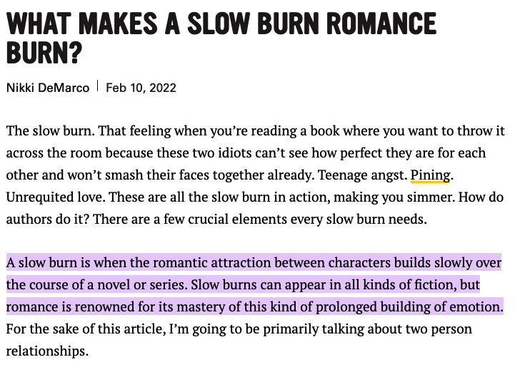 사실 이 단어를 소개하고 싶어서 이 글을 썼다고 해도 과언이 아니다. 모든 사랑이 첫눈에 시작된 건 아니다. 천천히 서로를 알아가며 ‘아, 이 사람에게 이런 매력이 있네?’ 놀라며 반하기도 하고, 오랫동안 알아 왔지만 어느 날 갑자기 상대가 이성으로 보이기도 해 설레는 마음을 키우기도 한다. 물이 서서히 끓듯 서서히 진행되는 로맨스를 ‘slow burn romance’라고 한다. 참고로 ‘do a slow burn’이라고 하면 갑자기 화를 빡 내는 게 아니라 그라데이션처럼 천천히 분노가 커져 가는 것이다. 북라이엇닷컴은 ‘slow burn romance’을 “등장인물들 사이의 로맨틱한 끌림이 소설이나 시리즈의 과정에서 천천히 커져가는 것을 말한다. 슬로우 번은 모든 종류의 소설에서 등장할 수 있지만, 로맨스는 이런 종류의 장기적인 감정 빌드업을 마스터한 것으로 유명하다”라고 썼다(아래 짤에서 보라색 하이라이트 부분).