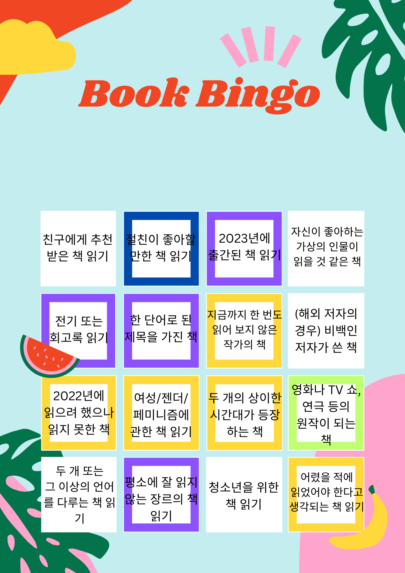 노란색이 1월, 보라색 2월, 연두색 3월, 남색이 4월이다. 한 줄 더 만들 수 있었는데 내가 아직 책 한 권을 못 끝내서… 그래서 현재는 총 빙고 두 줄이다. 다음 달에 한 줄 더 만들어 보자!