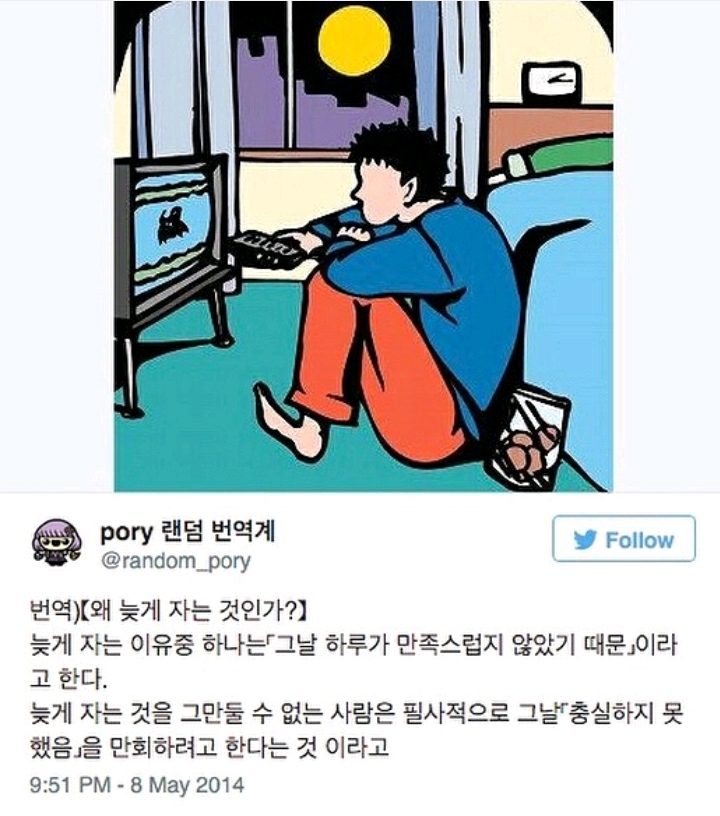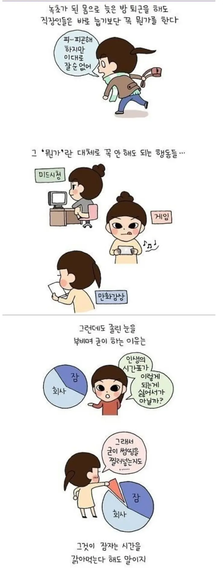 아래 짤들은 인터넷에서 보신 적 있을 것이다. 대략 ‘직장인들이 평일에 늦게 자는 이유.jpg’ 같은 제목을 달고 올라오는 이런 글들은 하루 종일 직장에 매여 있다가 퇴근 후 조금이나마 자신의 삶을 살아 보려고 하는 직장인들의 마음을 대변한다.