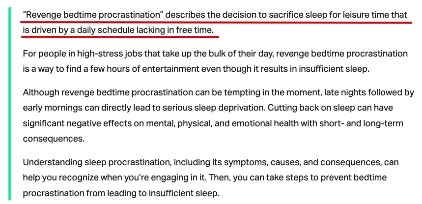 “보복적 취침 시간 연기”는 자유 시간이 부족한 일상의 스케쥴로 인해 여가 생활을 (즐기기) 위해 수면을 희생하려는 결정을 가리킵니다.