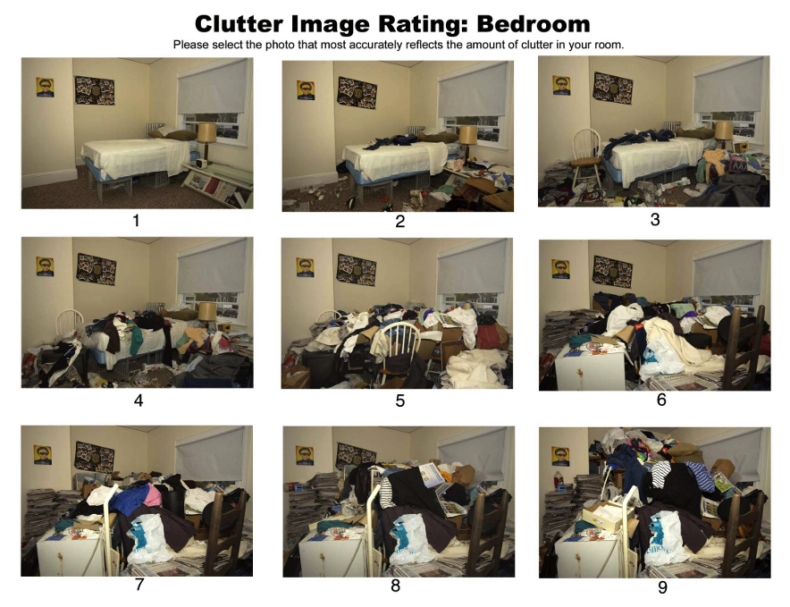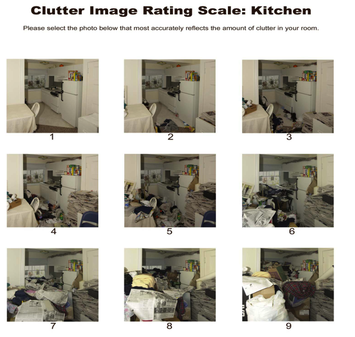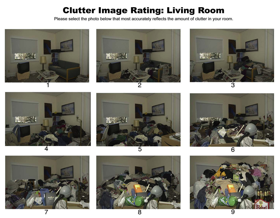 하지만 그것들은 대체로 극단적인 사례여서, 만약에 본인이 현실에서 ‘혹시 나도 (또는 가족이나 지인이) 호더인가? 이 정도면 슬슬 위험한 지경이려나?’ 하고 의심이 든다면 과연 그 생각이 맞는 것인지 아닌지 헷갈릴 것이다. 감기처럼 작은 질병도 일단 초장에 이를 인지해야 빨리 낫기 쉽듯이, 저장 장애 같은 정신적인 문제는 특히 치료를 위해 빠른 진단이 중요하다. 그럴 때 도움이 될 만한 정보가 있다. 국제 강박 장애 재단(International OCD Foundation)은 저장 장애를 진단하는 데 도움이 될 만한 9단계 사진 자료를 제공한다. 아래 사진들을 유심히 살펴보고 자신의 공간과 비교해 보시라. 자신의 공간이 3단계 정도로 보인다면, 지극히 정상적인 보통 가정집 (standard household clutter) 수준이다. 4단계 이상부터는 저장 장애가 의심되니 도움을 받는 것이 권장되고, 7단계는 ‘심각한 보호 이슈(significant safeguarding issues)’가 있는 수준이다.