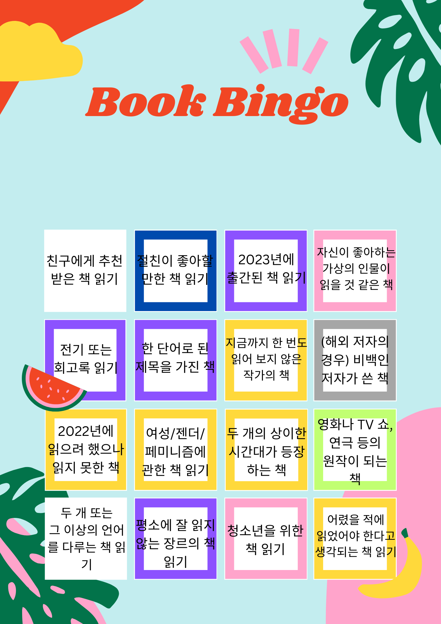 빙고 두 줄이 더 생겼다! 아래의 두 항목을 채웠기 때문이다(아래 빙고 이미지에서 핑크색 테두리인 항목이 6월에 성공한 챌린지이다). 청소년을 위한 책 읽기는 비교적 쉬웠다. 청소년 문학 중 하나를 골라잡으면 되니까. 비록 올리버 폼마반의 <나를 팔로우하지 마세요>는 크게 감흥이 없는 책이었지만 어쨌든 챌린지는 성공했다.
