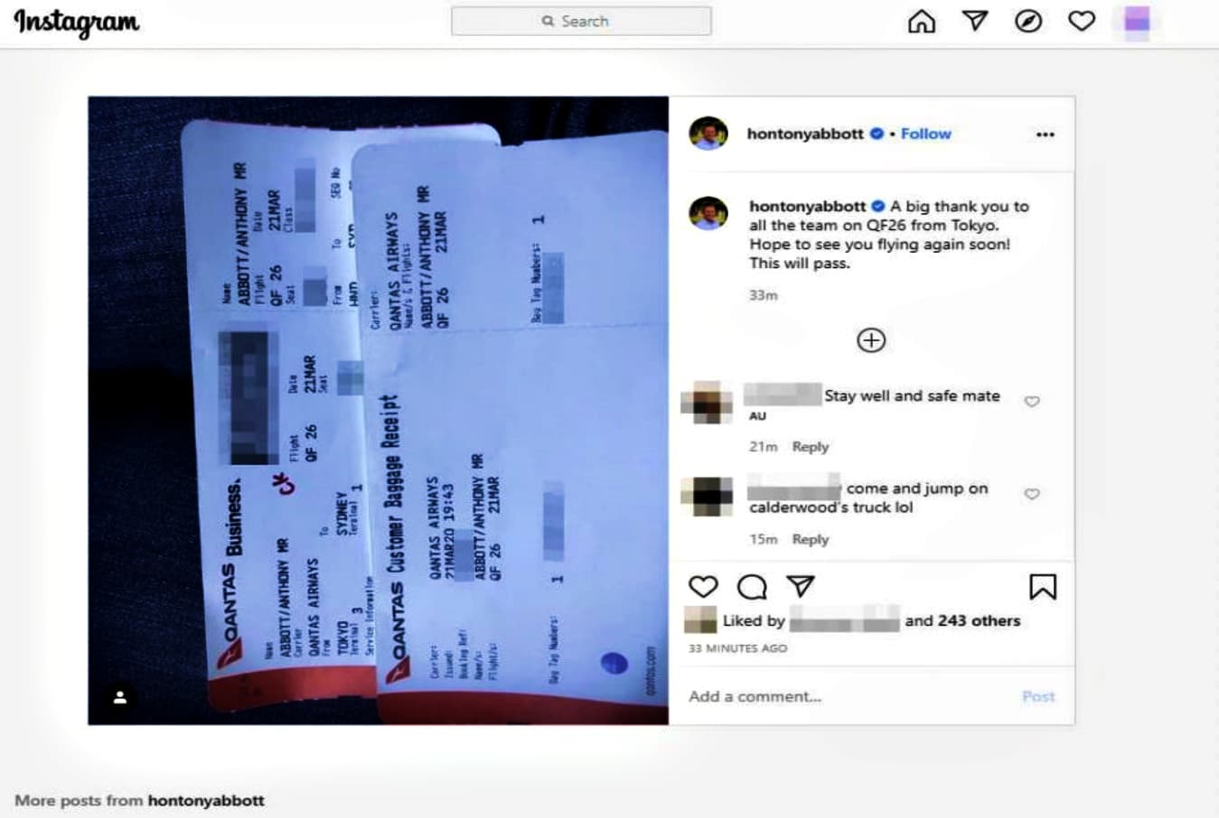 그런 의미에서 오늘은 호주의 전 총리 토니 애벗(Tony Abbott)이 인스타그램에 비행기표 사진을 올렸다가 한 해커에 의해 개인 정보를 털렸던 이야기를 나누고자 한다. 토니 애벗은 2013년부터 2015년까지 제28대 호주 총리직을 맡았다. 2020년 3월 22일, 그는 도쿄에서 시드니로 돌아오는 항공편 비행기표의 사진을 인스타그램에 업로드한다. 이 인스타그램 포스트가 가져올 후폭풍에 대해서는 까맣게 모른 채.