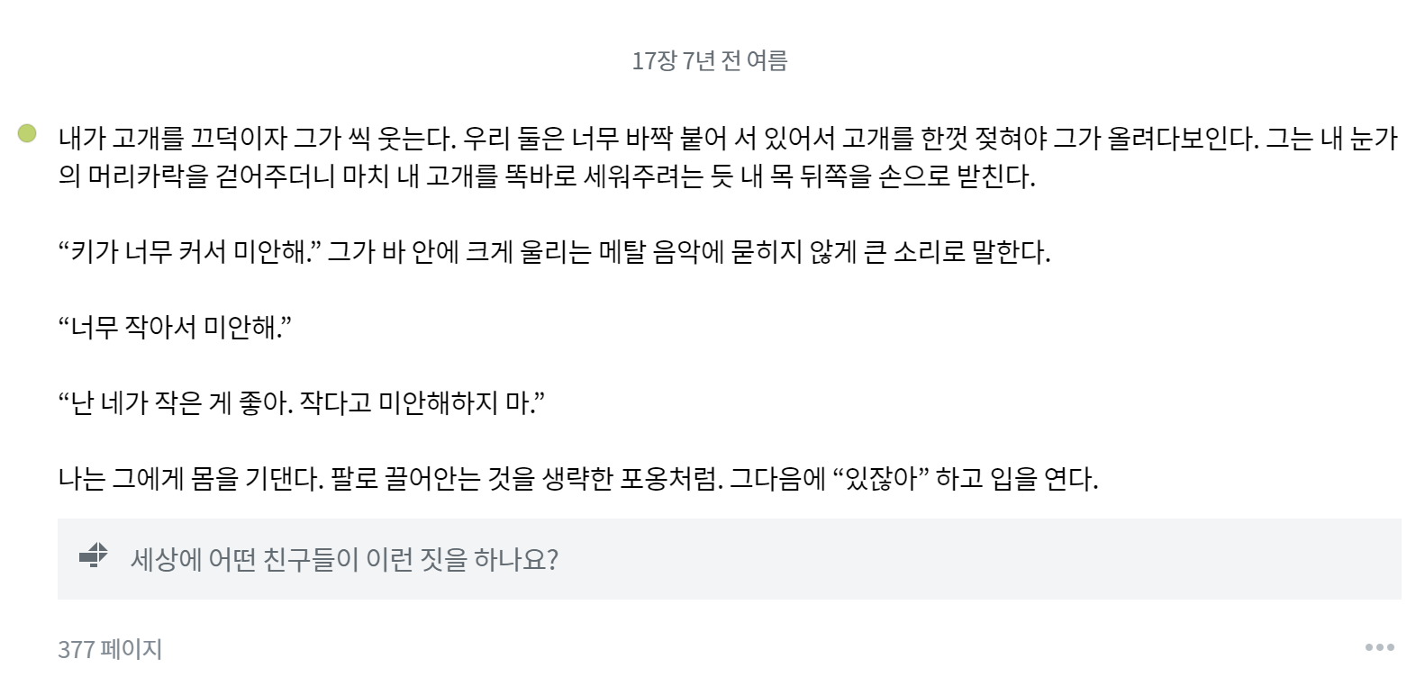 이 소설은 현재와 과거 시점이 번갈아가며 나오는데, 위에 내가 인용한 마지막 메모를 쓴 때가 소설 속에서 이미 7년 전이라는 점을 상기하자. 만난 지 한 3년쯤 됐던 시점에 이미 둘은 친구가 아니었다고!! 아니, 친구에서 사귀는 사이가 된다는 트로프(trope, 이 글 참고)는 나도 참 좋아하지만, 그렇다고 이미 둘이 사귀는 수준으로 행동하는데 각자 그냥 ‘친구’일 뿐이라고 기만하는 것은 친구 사이라고 인정할 수 없다! 누가 애초에 각자 사귀는 애인이 없는 사이에서 이성 사람 친구랑 단둘이 여행을 간단 말인가? 쌍방향 짝사랑 삽질도 정도가 있지. 애초에 이성 사람 친구라는 건 그렇게 애틋한 존재일 수가 없는 거 아닌가? 남사친이랑 하루 종일 전화를 한다거나, 정수리에 입을 맞춘다거나, 몸을 기대는 건 이미 친구의 범주를 벗어났는데 이 무슨… 내가 ‘친구에서 연인으로’ 발전하는 이야기에서 좋아하는 건 아주 조금만 친밀한 행위(예컨대 물건을 전달해 줄 때 손끝이 살짝 닿는다는가)를 할 때 두근두근 설레는 마음을 느끼면서 그걸 숨기고자 애쓰는 점이라고! 이렇게 대놓고 친구 이상의 일을 다 하면서 정작 사랑한다는 말은 안 하고 ‘그를 잃을까 두려워’ 운운하는 건 그냥 기만이지. ‘(이성 사람) 친구’인 상대에 대한 마음을 자각했으면 그냥 아예 당당하게고 뻔뻔하게 대시를 하든가 아니면 숨기려고, 그도 아니면 포기하려고 해야 하는 거 아니냐?