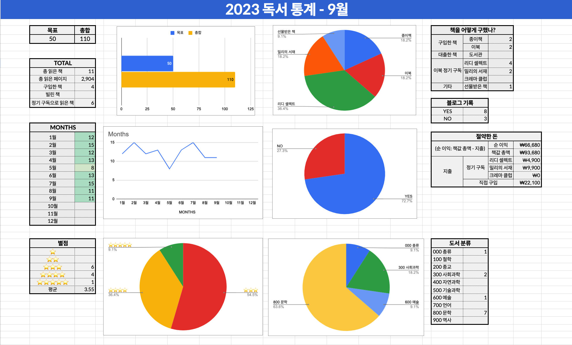 이번 달에는 무려 종이책도 샀고(한국에 잠시 들렀는데 이때 알라딘 중고 서점에서 책을 여러 권 사서 가져왔다), 이북도 샀다. 선물 받은 책도 있어서 ‘기타’에 넣었다. 생각해 보면 휴가 기간이 있어서 책을 더 많이 읽었어도 놀랍지 않을 텐데, 여행 중에 책을 읽기란 사실 거의 불가능했다. 음, 그래도 11권이면 적게 읽은 건 아니니까. 이번 달 통계 그래프도 아름답게 잘 나왔다.