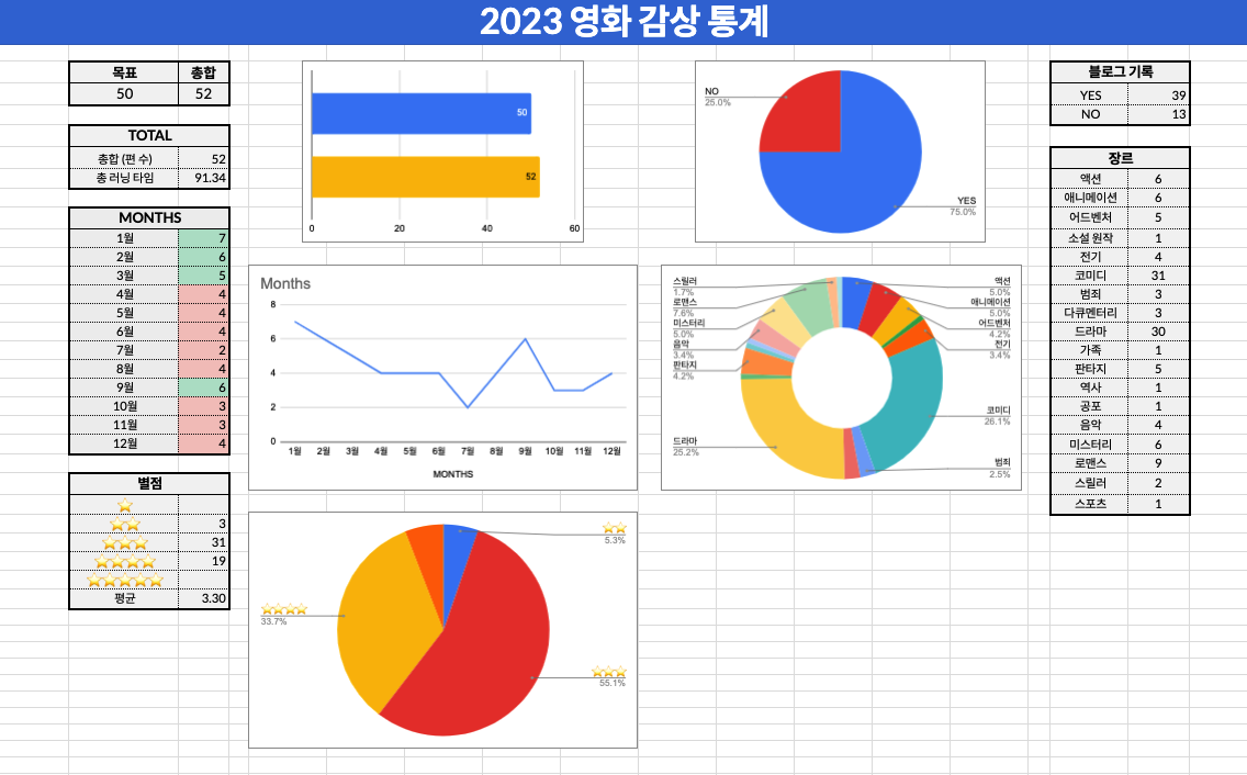 2023년 한 해 내가 본 영화들을 전부 통계 내 보았다. 한 해에 50편 보는 게 목표였는데 52편으로 간당간당하게 통과. 한 달에 영화를 4편 정도 본 셈인데 생각보다 쉽지 않다… 책을 읽는 것보다 어렵다. 왜일까? 책은 출퇴근 길에도 조금씩 (핸드폰으로도) 읽을 수 있지만 영화는 그렇게 보지 않아서인 듯.