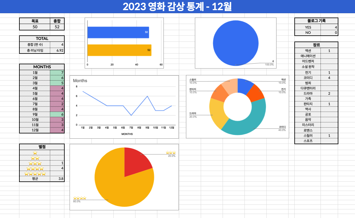 2023년 한 해 내가 본 영화들을 전부 통계 내 보았다. 한 해에 50편 보는 게 목표였는데 52편으로 간당간당하게 통과. 한 달에 영화를 4편 정도 본 셈인데 생각보다 쉽지 않다… 책을 읽는 것보다 어렵다. 왜일까? 책은 출퇴근 길에도 조금씩 (핸드폰으로도) 읽을 수 있지만 영화는 그렇게 보지 않아서인 듯.