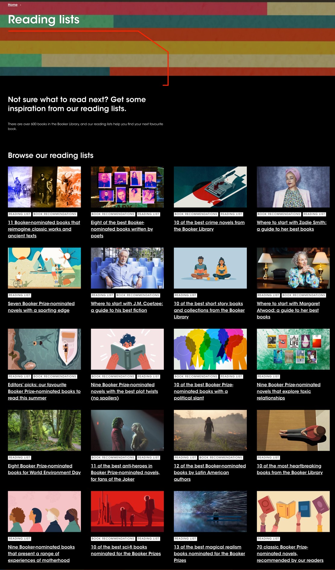 그것은 바로, 부커상 웹사이트를 참고하는 것이다. 부커상이라고 하면, 스웨덴의 노벨 문학상과 프랑스의 공쿠르상과 함께 세계 3대 문학상으로 손꼽히는 권위 있는 상(賞)이다. 부커상 공식 웹사이트에서는 현재까지 부커상을 수상한 작품들뿐 아니라, 부커상 후보에 올랐던 작품들을 바탕으로 다양한 주제를 가지고 추천 목록을 만들어 놓았다. 위에 있는 부커상 웹사이트 하이퍼링크를 통해 들어간 다음, ‘Features’ 코너를 클릭하면 내려오는 상자에서 ‘Book recommendations’를 눌러 보시라.