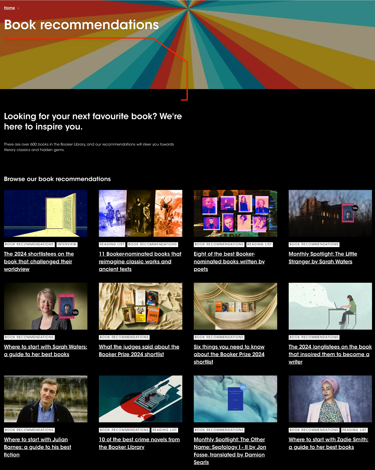 대략 다음과 같은 화면이 보일 것이다. 맨 윗줄 왼쪽부터 ‘세상을 보는 관점을 바꾸는 2024년 부커상 후보 작가들’, ‘고전 작품과 고대 텍스트를 다시 상상한 11편의 부커상 후보작들’, ‘시인이 쓴 최고의 부커상 후보 책 8권’ 등 정말 다양한 주제로 책을 골라서 추천해 놓았다. 사라 워터스가 쓴 <리틀 스트레인저>를 2024년 10월의 스포트라이트작으로 선정하고 책 소개도 곁들여 놓았다.