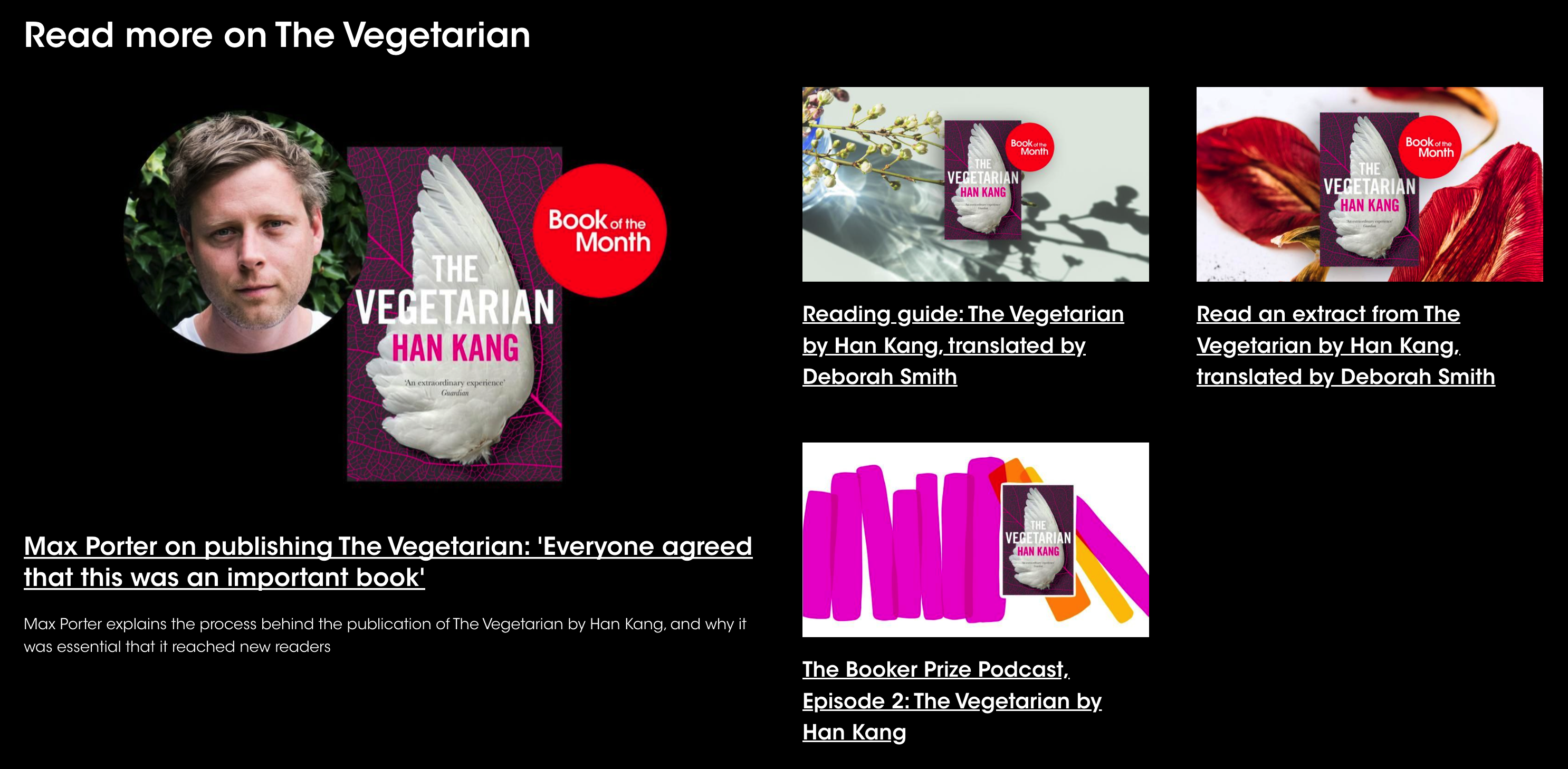 그냥 휙 둘러봐도 흥미로운 포스트가 참 많다. 2022년 1월에 올라온 ‘내 서재에 있는 책: 안톤 허(What’s on my bookshelf: Anton Hur)’라는 포스트에서는 정보라 작가의 <저주토끼>를 영어로 옮긴 번역가 안톤 허 씨가 추천하는 책들을 소개했다. 신경숙 작가의 <엄마를 부탁해>와 김보영 작가의 <당신을 기다리고 있어>가 포함됐다. 좀 더 최근인 2024년 9월 포스트 ‘부커 도서관에서 최고로 흥미진진한 책 13권(13 of the best page-turners from the Booker Library)’에서는 2016년 부커상 수상작인 한강 작가의 <채식주의자>를 추천한다. 한강 작가 이야기가 나왔으니 말인데, 부커상 웹사이트에는 인터뷰들도 있다(메뉴에서 ’Features’를 클릭한 후 ’Interviews’ 선택). 한강 작가 인터뷰도 당연히 있다! <채식주의자>가 그토록 많은 독자를 만날 줄 몰랐다는 작가의 말을 딴 이 인터뷰는 끄트머리에 아예 이 작품에 대한 다른 참고 페이지들도 링크해 놓았다. 작가 맥스 포터가 <채식주의자>에 관해 한 논평과 독서 가이드, <채식주의자> 영역본 발췌, 그리고 이 작품에 관한 팟캐스트까지.